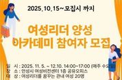 뉴스온경기 | 안성시는 지역사회 발전을 이끌 열정있고 능력있는 여성 지도자를 발굴·육성하기 위해 ‘2025년 안성시 여성리더 양성 아카데미’ 기본과정 교육 참가자를 모집한다. 이번 아카데미는 적극적으로 참여할 수 있는 여성 시민 누구나 신청할 수 있으며, 신청기간은 오는 10월 15일부터 시작된다. 교육은 11월 5일부터 12월 10일까지 6주간 매주 수요일에 안성시여성비전센터 (발화대길 25) 1층 공유오피스에서 진행 될 계획이다. 교육 내용은 ‘나는 당신이 행복했으면 좋겠습니다.’ 라는 주제로 김경희 강사의 행복소통 리더십 강의로 개강식을 열고 2~3주차는 감성을 담아 나를 알리는 SNS 활용법 이론편과 실습편, 4~5주차에는 나만의 비서 만들기 챗봇과 생성형 AI교육 이론편과 실습편을 구성하여 최신 트렌드에 맞춘 리더 역량 강화를 위한 강의들로 구성했으며 6주차에는 퍼실리테이션 기법을 활용하여 지역 내 현안 문제를 파악하고 리더로서 해결 방법을 제시하는 과정을 마지막으로 수료식을 가질 예정이다.