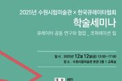뉴스온경기 | 경기도 수원시립미술관은 한국큐레이터협회와 함께 2025년 학술 세미나 '큐레이터 공동 연구와 협업-코퍼레이션 힙'을 주제로 12월 12일 오후 1시 수원시립미술관 행궁 본관에서 개최한다. 이번 세미나는 기관과 기획자 간 연구의 지평을 확장하는 담론의 장을 위해 수원시립미술관과 한국큐레이터협회가 업무협약을 체결하고 공동 연구와 협업 사례를 조명한다. 세미나는 “큐레이터 공동 연구와 협업-코퍼레이션 힙”을 주제로 김현숙 KISO미술연구소 소장이 한일 공동 연구 전시 사례로서 《한일 근대미술가들의 눈》의 연구 과정을 발표하며 세미나의 첫 문을 연다. 전북도립미술관 이애선 관장은 “빈손의 연대, 가득한 변화 – 연대는 선택이 아닌 책임”이라는 주제로 전라북도 소재 예술기관들의 협업과 연대 사례를 살펴보며, 이영준 김해문화관광재단 정책홍보팀장은 공동 연구와 협업 전시가 어우러진 사례로서 “문예회관 전시실, 협업과 연대로 풀어보는 대안들”을 발표한다. 2부에서는 한국화학연구원 고영주 전문경영위원이 “대전 과학예술 융합 사례”에 관한 연구를 공유하고, 박지영 독립큐레이터는 경남도립미술관에서 기획한 《실로 어마어마한 일이다