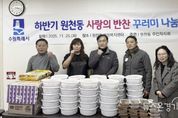 뉴스온경기 | 수원시 영통구 원천동 행정복지센터는 원천동 주민자치회 주관으로 진행하는 '2025년 사랑의 반찬 꾸러미 나눔' 사업을 통해 관내 취약계층 100가구에 반찬 나눔을 실시했다고 25일 밝혔다. 주민자치회는 지역의 어려운 이웃을 돕기 위해 반찬을 직접 조리해 기초생활수급자, 차상위계층, 복지 사각지대 대상자 등 총 100가구에 전달했다. 1차 꾸러미는 2025년 6월 17일, 2차 꾸러미는 11월 25일에 각각 배부를 완료했다. 올해 꾸러미 구성은 주민자치회 위원들이 정성껏 준비한 제육볶음 등으로, 원천동 건강복지팀과의 연계를 통해 대상 가정에 직접 방문하여 전달하며 안부 확인도 함께 진행했다. 원천동은 이번 나눔 활동을 통해 소외된 이웃들의 정서적 고립감을 해소하고, 더 따뜻한 지역 공동체 조성에 기여할 것으로 기대하고 있다. 윤두원 원천동 주민자치회장은 “사랑의 꾸러미 나눔을 통해 관내 취약계층을 지원하고 이웃사랑 실천을 위한 좋은 기회가 됐기를 바란다”고 전했다.
