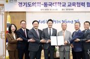 뉴스온경기 | 경기도의회는 23일 오전 의장 접견실에서 동국대학교와 교육협력 및 학술교류를 위한 업무협약(MOU)을 체결했다. 이날 협약식에는 김진경 의장(더민주, 시흥3)과 고준호 의원(국민의힘·파주1), 김완규 의원(국민의힘·고양12), 이병숙 의원(더민주·수원12), 박호순 의정국장이 참석했다. 동국대학교에서는 윤재웅 총장, 김용현 교무부총장, 김승용 대학원장, 유한림 BMC(바이오메디캠퍼스) 행정처장 등이 함께 자리해 협약의 의의를 더했다. 양 기관은 이번 협약을 계기로 ▲의정 발전을 위한 정보 교류 ▲전문 인재 양성을 위한 교육·연구 지원 ▲도의원 및 의회 직원 대상 대학원 장학금 지원 등 의정 활동 역량 강화를 위한 체계적인 교육 협력에 나서기로 했다. 윤재웅 총장은 “대학의 교육·연구 역량을 공유함으로써 경기도 발전에 기여할 수 있게 되어 뜻깊다”며 “경기도의회와의 지속적인 협력을 통해 실효성 있는 교육 지원을 이어갈 수 있도록 최선을 다하겠다”라고 말했다. 김진경 의장은 “의회에 대한 도민의 기대는 점점 더 복잡해지고 다양화되고 있는 만큼 의회 구성원 모두가 더 많이 배우